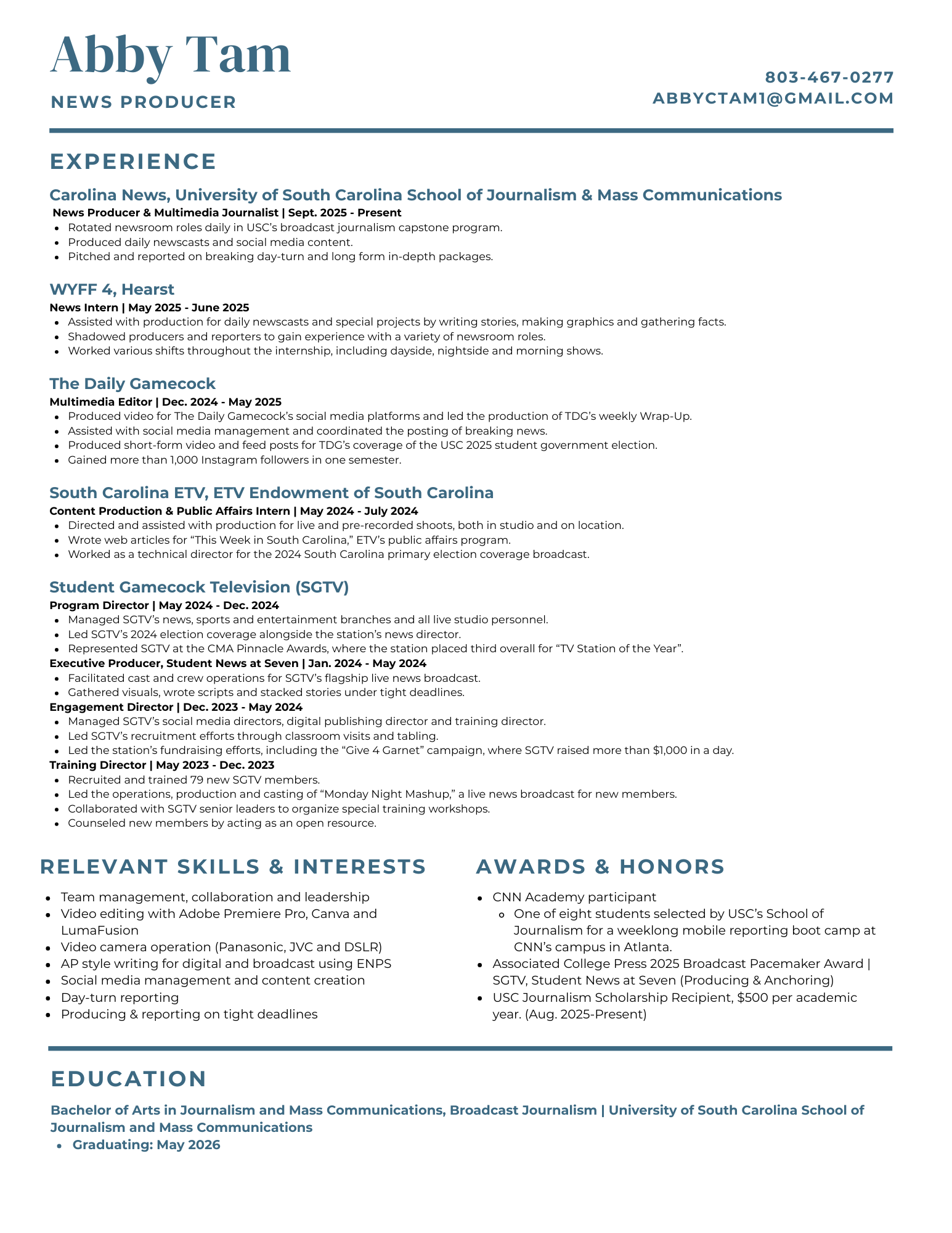 I'm a broadcast journalism student at the University of South Carolina's School of Journalism and Mass Communications, graduating in May 2026. Post-grad, my goal is to tell stories as a television news producer or reporter.